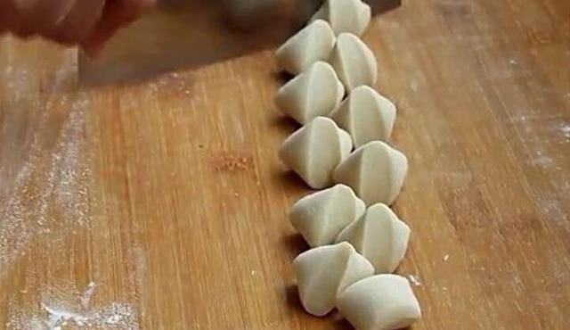 7、下面就要做劑子瞭,先把面團切開分半,然後取一般揉搓成長條,在用刀切成小一點的劑子!