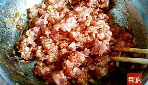 1.肉餡放耗油,鹽,少量生抽,順著一個方向,攪拌上勁