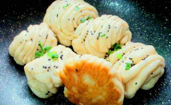 第五步:準備一個鍋,在鍋底均勻地刷上一層食用油,開小火預熱,油熱後把肉卷放進去,煎三分鐘後加入清水,清水要沒過花卷的一半就可以,蓋上鍋蓋,大火將水煮幹,關火後燜5分鐘。