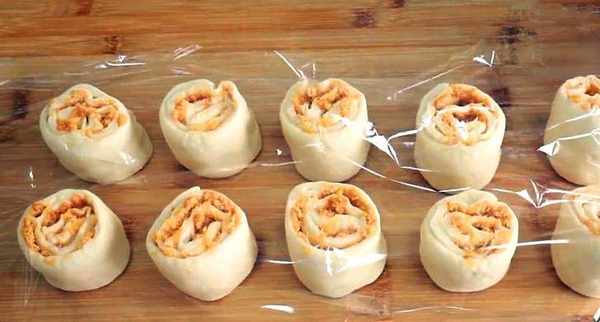 第四步:將整理好的長條切成大小均勻的小段,再用手攥緊實,蓋上保鮮膜二次餳發十五分鐘,(一定要二次餳發,否則肉卷吃起來不宣軟)