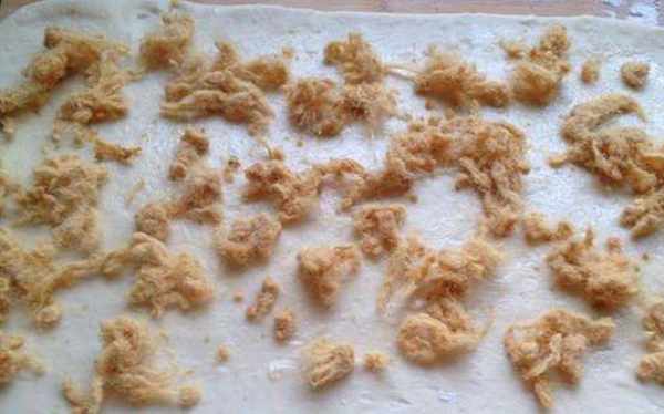 第三步:面皮搟好以後,先刷上一層沙拉醬,也可以放點芝士,再撒上一層肉松,用手將肉松整理均勻,從一邊卷起,卷成一個長筒形。