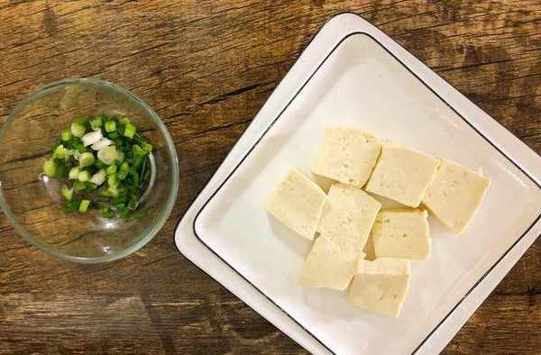 第一步:生蔥洗幹凈後切成蔥花備用,將一塊豆腐切成大小均一的小塊備用。