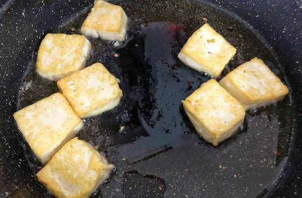 第三步:起鍋熱油,花生油燒至七成熟後放入豆腐,改小火慢煎,控制火候,煎至表面金黃色即可出鍋備用。