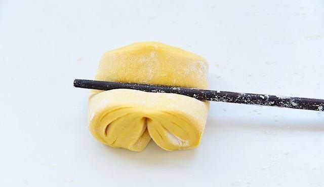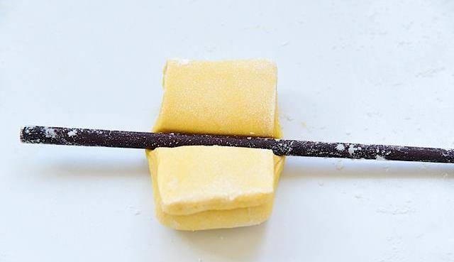 7、切成均等的方塊,取一塊用筷子在中間壓一下。