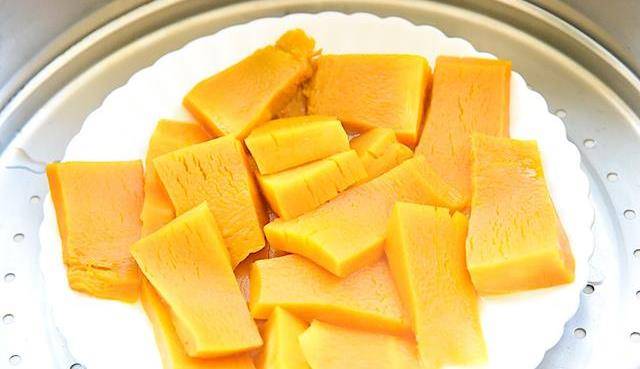 1、把南瓜洗凈去皮切成塊放入鍋中篦子上大火蒸熟。