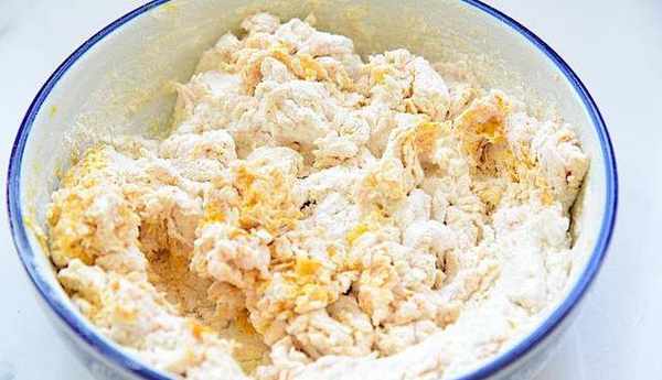 3、把南瓜泥、普通面粉、細砂糖、酵母混合先用筷子攪拌成絮狀。