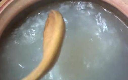 砂鍋裡加水,燒開後,倒入醃制好的大米。