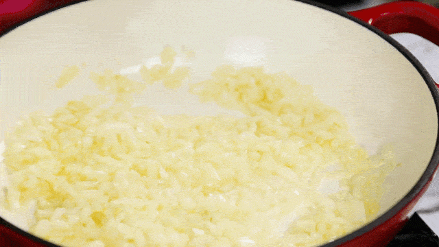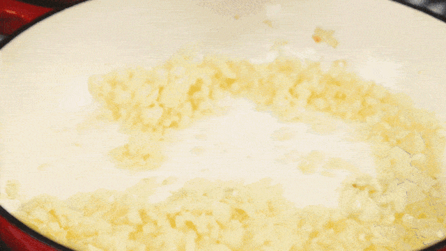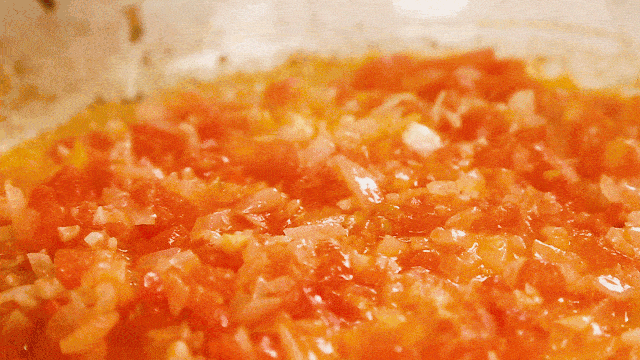 3.另起鍋加黃油、橄欖油燒熱,下洋蔥、蒜、炒至變軟變透明,放入西紅柿丁炒至出紅油