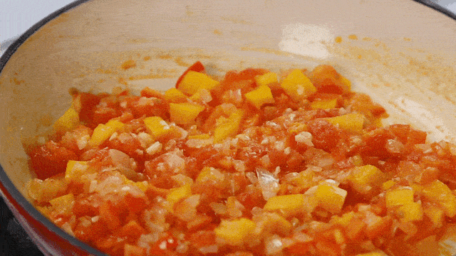 4.鍋中倒入彩椒丁、放入紅椒粉、百裡香,翻炒幾下後倒入海鮮高湯,加鹽、黑胡椒粉調味,蓋上蓋子燒滾,把煎好的海鮮連同湯汁倒入鍋中,待再次燒滾後撒上香芹末即可關火出鍋