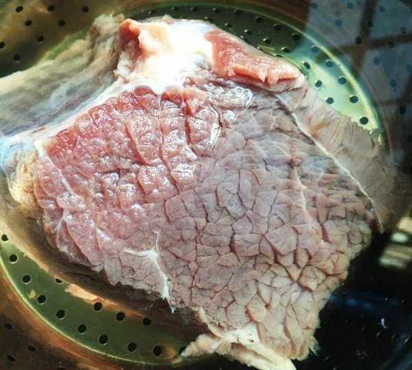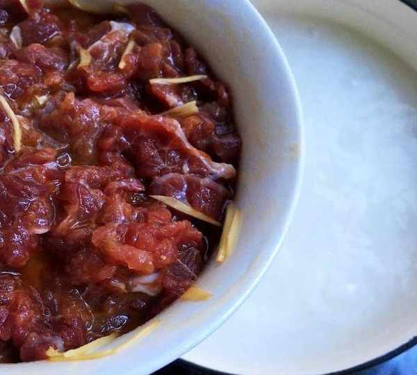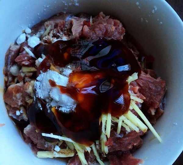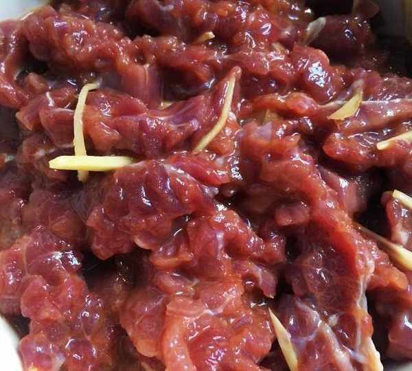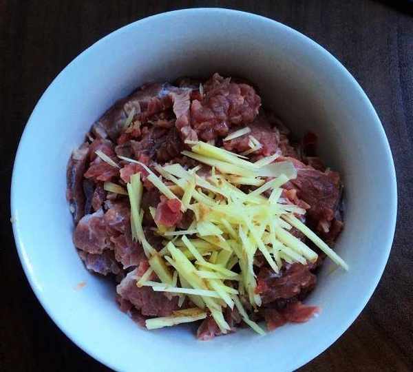 第12步、放入醃好的牛肉,不喜歡薑絲可提前挑出來。