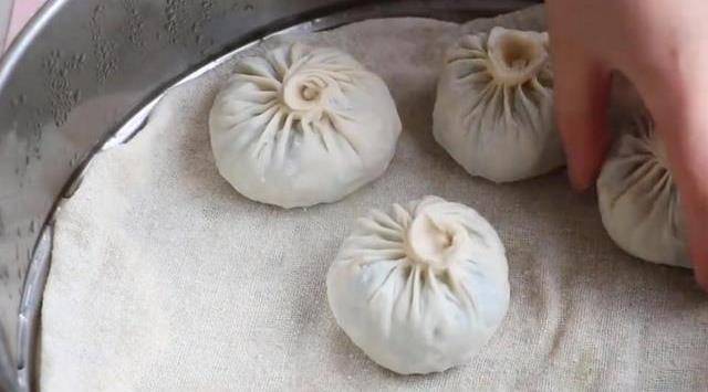 面團醒好之後進行揉面,之後搓成長條,切成大小均勻的小面劑,這個劑子比餃子面劑稍微大一點就可以瞭。然後撒點幹面粉給它搟薄,越薄越好。包上餡料以後跟包子一樣包起來,包好的包子放在蒸籠梯上。