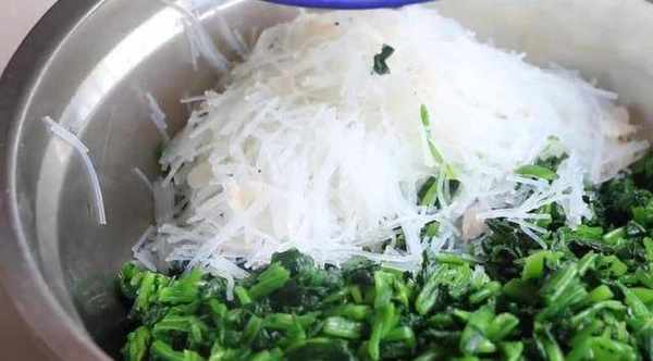 現在我們來調餡料,將菠菜提前焯水,然後切碎,菠菜一定要擠幹水分,然後加入泡水的粉絲,加一點蝦米和炒好的雞蛋碎,簡單的調一下味,胡椒粉,兩勺耗油,滴幾滴香油,再倒兩勺熟油,攪拌均勻就可以瞭,最後包的時候再放鹽。