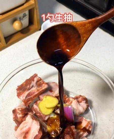 1.排骨7-8塊,放入洋蔥,倒入薑片,1勺生抽,1勺料酒,抓勻醃制10分鐘。