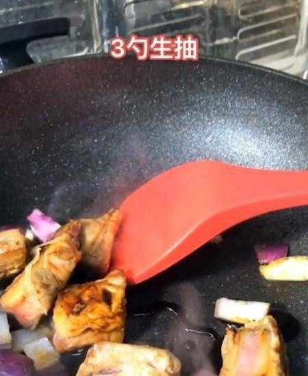 4.再加入3勺生抽,1勺老抽,1勺香油,翻炒均勻。