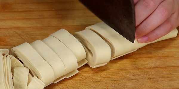 2、先來處理一下雞肉,將咱們準備好的雞肉先浸泡並清洗,清洗完了之後剁成合適大小的小塊,然後先放到一旁控一下水分。接下來再處理一下千張,將準備好的千張從中間對半切開,然後疊放在一起,再卷成長條,然後將卷好的長條切成大概一釐米左右寬度的長條,切好之後咱們將它放到一個盤中。