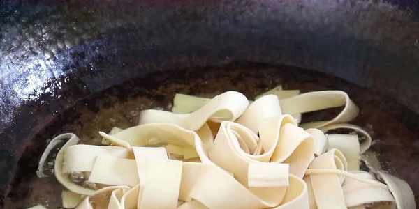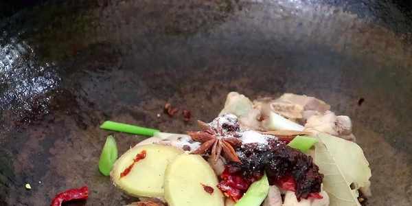 4、起鍋燒油要多倒一點食用油。然後把油燒到五成熱,再把切好的千張條全部放進去炸一下,一直炸到表面金黃之後撈出。撈出之後控油,然後再把大部分的油倒掉,留下少許底油。將雞塊,薑片,葱段,幹辣椒放進去,然後再加上花椒,香葉,八角,桂皮,豆瓣醬,胡椒粉。