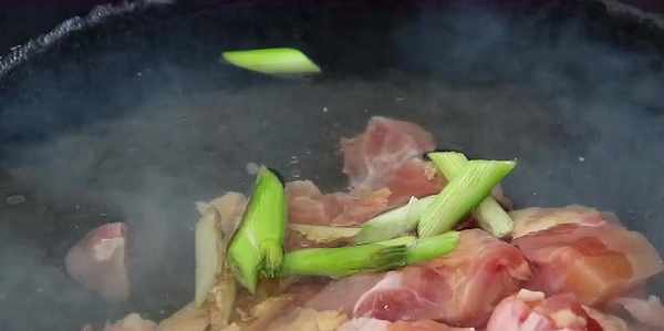 3、將咱們洗淨並控幹血水的雞塊冷水下入鍋中,然後加入提前切好的薑片和小葱段,再加入適量料酒,用大火焯出血沫。大概五分鐘之後血沫就已經被煮得差不多了,咱們用一個勺子將浮沫打出來。然後再把雞塊撈出來,雞塊也可以再清洗一遍,如果血沫去得比較乾淨的話就不用洗了。
