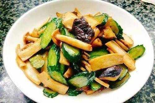 1.將杏鮑菇和香菇切成薄片,切成小塊的海鮮蘑菇。 2.黃瓜片使用。