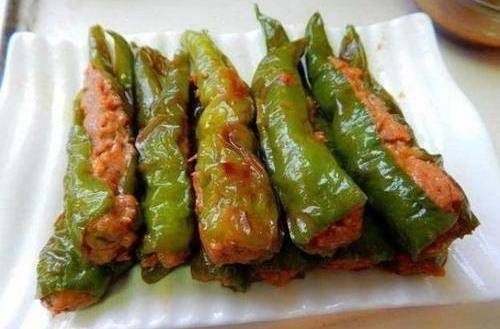 4.再往鍋裡加些油,加入豆eh,切碎的蔥和大蒜,直到變香,然後倒入醬油,醋,糖和一小勺水煮沸,然後在鍋中煮青椒約2 5分鐘,然後將釀青椒塞滿盤子,將湯留在鍋中。 5.在鍋裡的湯中加一點水淀粉使其變稠,然後將其均勻地倒在虎皮釀的青椒上,然後放在桌上即可。