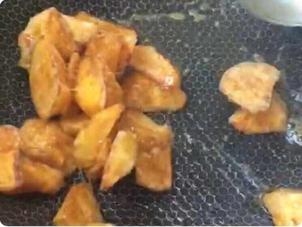 第三步:一勺水加入湯,再點兩滴白醋,少許玉米油,小火熬制成有焦糖色,倒入炸好的紅薯,把糖均勻裹上,就可以出鍋啦。