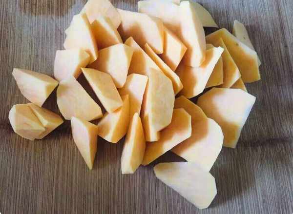 第一步:紅薯去皮切滾刀塊,大小均勻即可。水開後焯水一分鐘左右,撈出來撒上玉米淀粉抓勻。