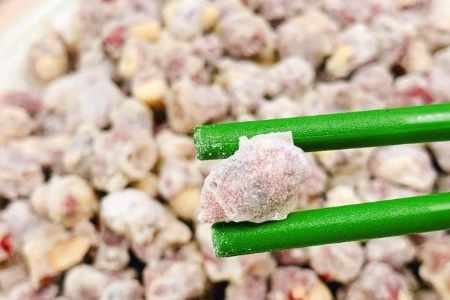 3、澱粉放入到花生中後,需要立即的攪拌土豆,不然土豆都會粘連在一起,從而影響賣相。