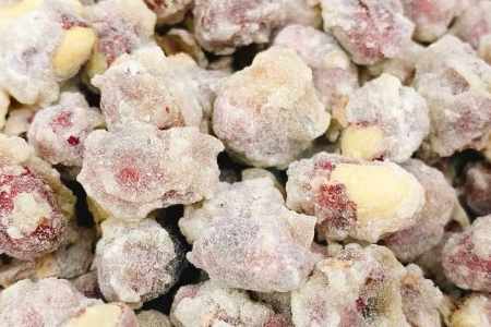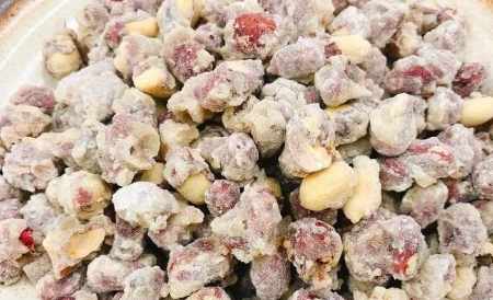 第四步:最後趁熱再鍋中撒上適量的澱粉,此時在不斷的攪拌花生,使花生每一顆都不粘連在一起即可起鍋食用。