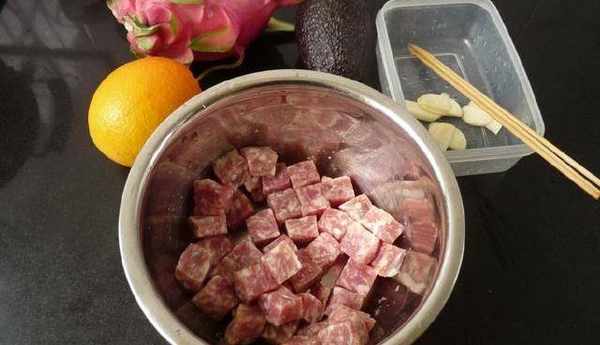 主料:牛肉粒250克,蒜5克,牛油果20克,奇異果20克,橙20克,橄欖油20克,生粉20克