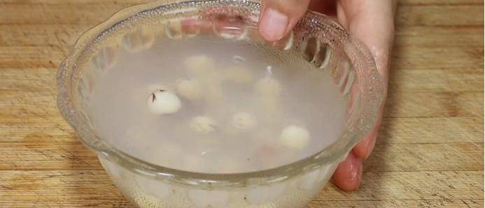 2、先把咱們準備好的綠豆取出來,將綠豆放到清水中清洗一遍,清洗完瞭之後咱們把水倒掉,然後再一次換上清水,這一次清水要稍微多一點,加入清水之後將它放到一旁浸泡兩個小時,綠豆用清水浸泡上瞭之後再將蓮子取出來,同樣是準備一個大碗,先將蓮子清洗一遍,然後加入適量多一點的溫水,將蓮子浸泡半個小時。