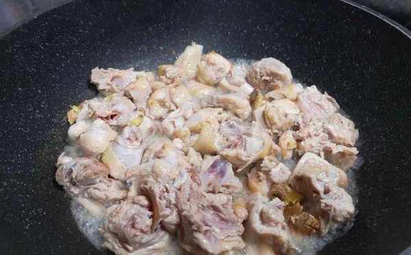 3、把雞肉也下進去,開大火炒到變微黃色,下米酒炒一下。