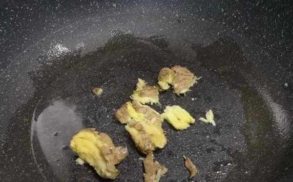 2、熱鍋下油,油不用倒太多,一點點就夠瞭,因為雞肉一會也會出油!油熱瞭下薑炒幾下爆香。