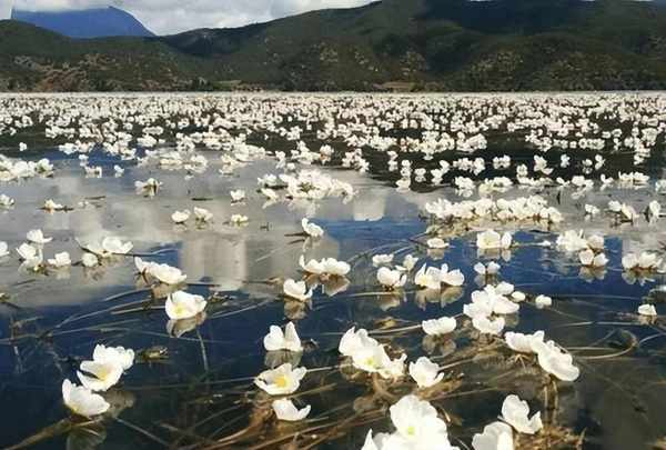 花期在5月到10月,其花開在水面、潔白無瑕,而它的植株則留在水裡,當地的摩梭人也稱它為“開普”。