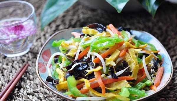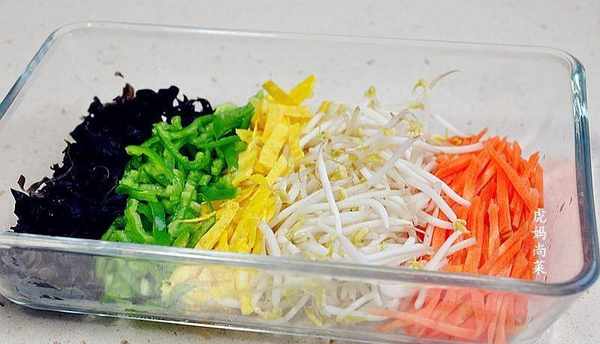 過程是油熱先炒胡蘿卜,再放入綠豆芽炒至軟塌,最後放木耳青椒和雞蛋絲。