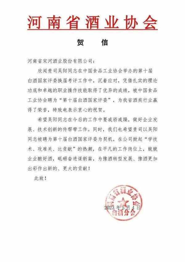 其中,設計中心技術中吳陽被新聘為第十屆白酒國傢評委,宋河酒業科研中心主任李富強、酒體設計中心副主任董金倉、酒體設計中心副主任李軍、酒體設計中心小樣室主任吳濤被續聘為第十屆白酒國傢評委;宋河酒業工藝師孫志新符合免試條件,被續聘為第十屆白酒國傢評委。