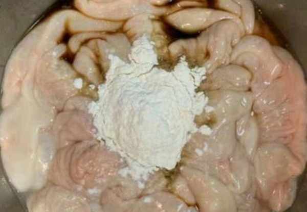 第五步:繼續倒入適量的面粉,揉一會,最後用清水沖洗幹凈,最後再次還原豬大腸的表面。
