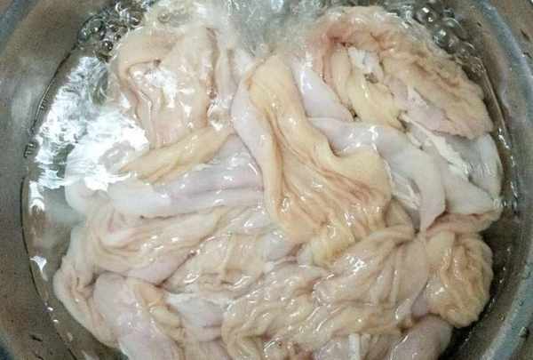 第4步:使用自來水會更容易。繼續清除豬大腸內部的脂肪和粘液,然後撈出瀝幹。