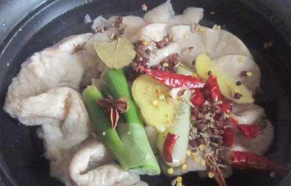 第六步:將洗凈的豬大腸、蔥薑片放入鍋中,倒入適量涼水,煮至浮粉熟透,撈出沖洗幹凈。