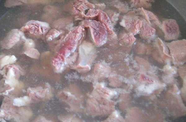 第四步:鍋內加入冷水,放入牛肉,大火燒開,倒入適量料酒,待泡沫和血水沸騰後,將牛肉撈出控水待用。