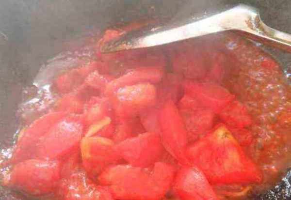 第六步:西紅柿炒至湯汁濃鬱,倒入牛肉拌勻,再倒入適量熱水。