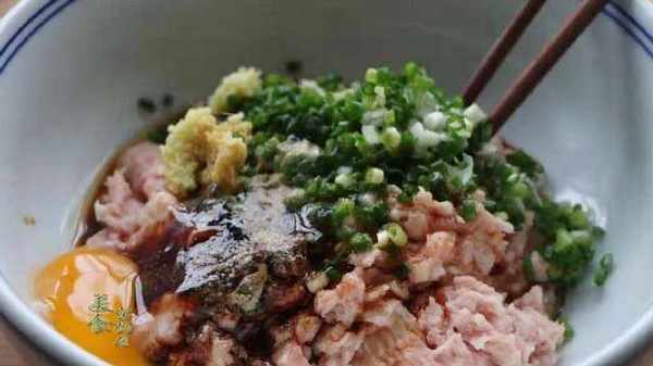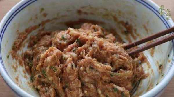 1、把1把小蔥切成蔥末,然後加入300克肉餡中,再加入1勺生抽,半勺老抽,1勺蠔油,少許十三香,再打入1個雞蛋,攪拌混合均勻,攪拌至如下圖般肉餡上勁即可。