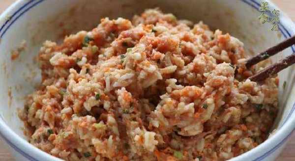 【準備食材】1碗米飯,300克肉餡,1把小蔥,1勺生抽,半勺老抽,1勺蠔油,少許十三香和食鹽,半根胡蘿卜