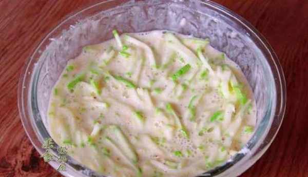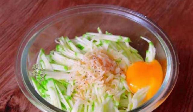 1、西葫蘆清洗幹凈後切成細絲,也可以借助工具擦成細絲,裝入碗中,然後再在碗中打入1個雞蛋和少許蝦皮,用筷子攪拌混合均勻備用。