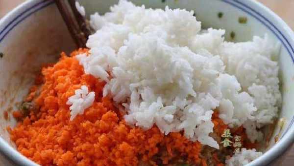 2、胡蘿卜清洗幹凈去皮,擦成絲,剁成胡蘿卜末,然後加入到攪拌好的肉餡中,再加入1碗剩米飯,米飯可以多加點,然後攪拌混合均勻即可。