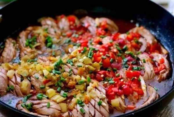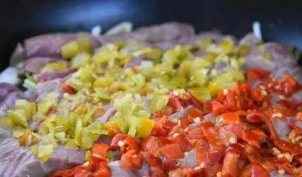 第五步:再鋪上豬裡脊肉,將青紅椒對半切開均勻鋪開。淋上調味汁,開大火蓋蓋燜1分鐘,開蓋撒上蔥花即可。