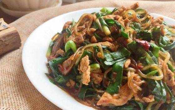第一步:韭菜洗凈切段,豆瓣醬切碎,薑切絲、蔥切碎。豬裡脊肉洗凈切絲,加少許胡椒粉、醬油、料酒、淀粉醃10分鐘。