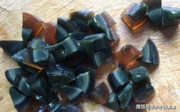 第三步,將皮蛋清洗幹凈,切成大塊。將皮蛋、瘦肉、薑末放入碗中,加少許鹽、糖和少許植物油,加少許黃酒;