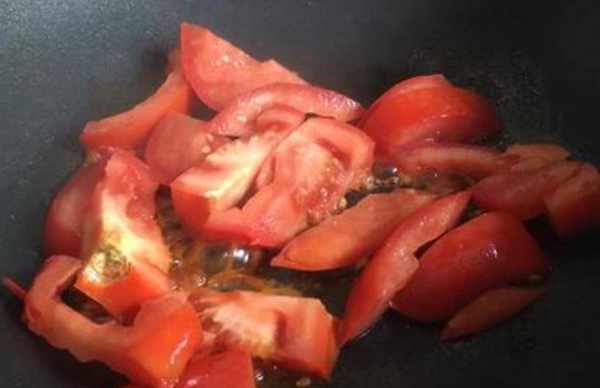第四步:繼續倒入西紅柿,翻炒至西紅柿出湯為止,倒入適量的水燒開。
