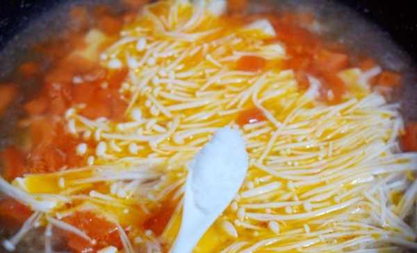 第五步:再倒入金針菇,煮至金針菇熟透,撒上適量的鹽,倒入適量的淀粉水,最後一次煮熟即可食用。
