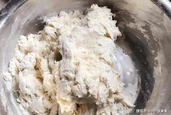 第五步:準備另一個幹凈的平底鍋,倒入適量的面粉和水,攪拌成絮凝劑,倒在面板上揉成面團。