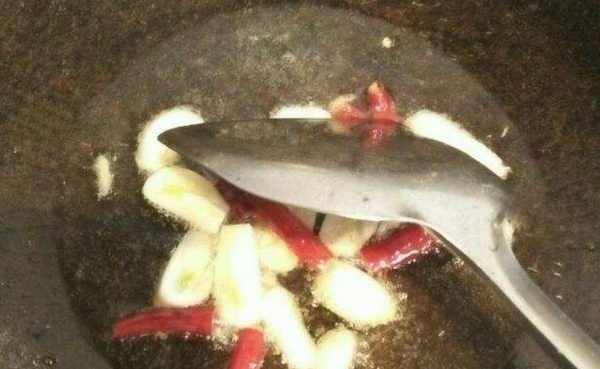 第三步:在平底鍋中加熱油。油燒開後,加入幹辣椒、蔥花和藥明,炒香。